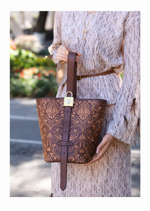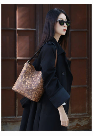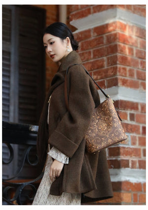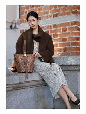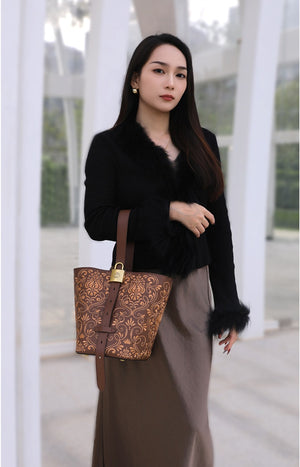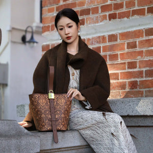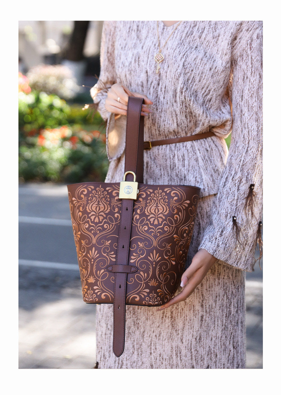 Inspired by the Dunhuang scroll-grass motif (also known as the honeysuckle or Tang grass pattern), this bucket bag blends classical Chinese decorative art with a modern, everyday silhouette. The flowing, interwoven vines symbolize endless vitality, resilience, and continuous good fortune—a meaningful design you can carry daily.