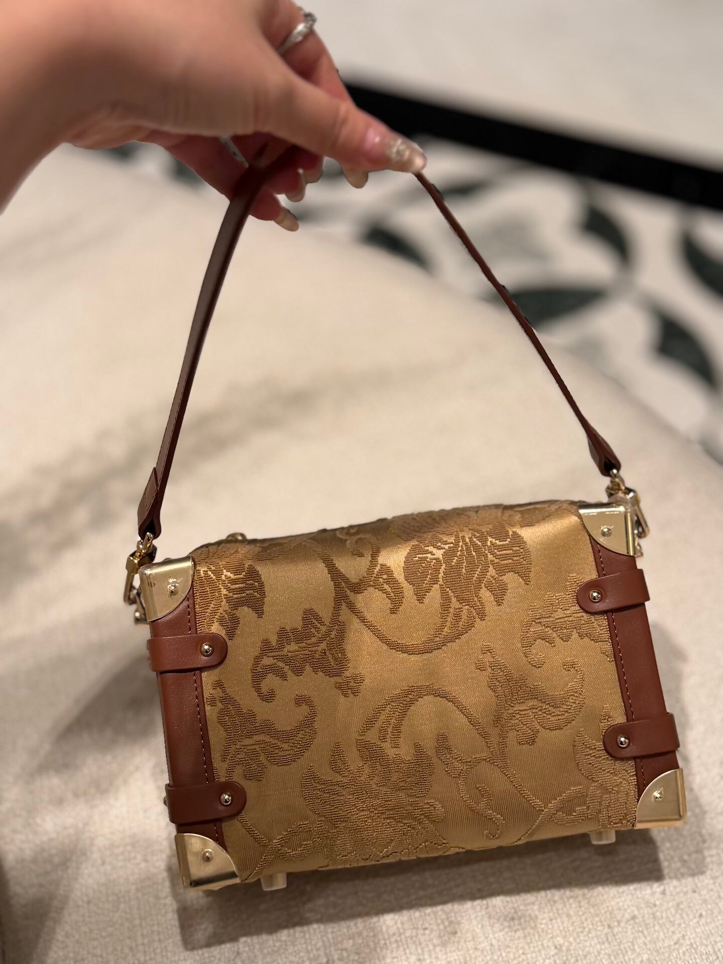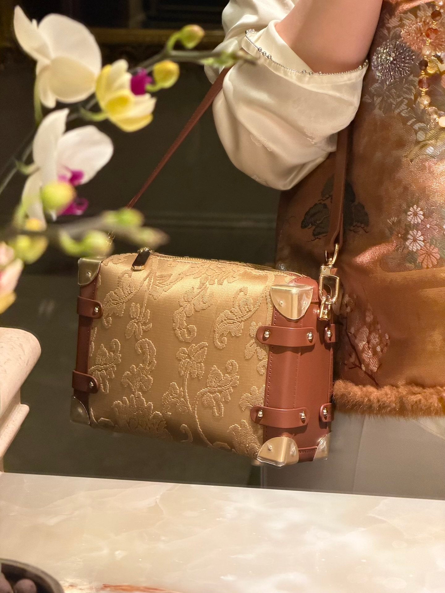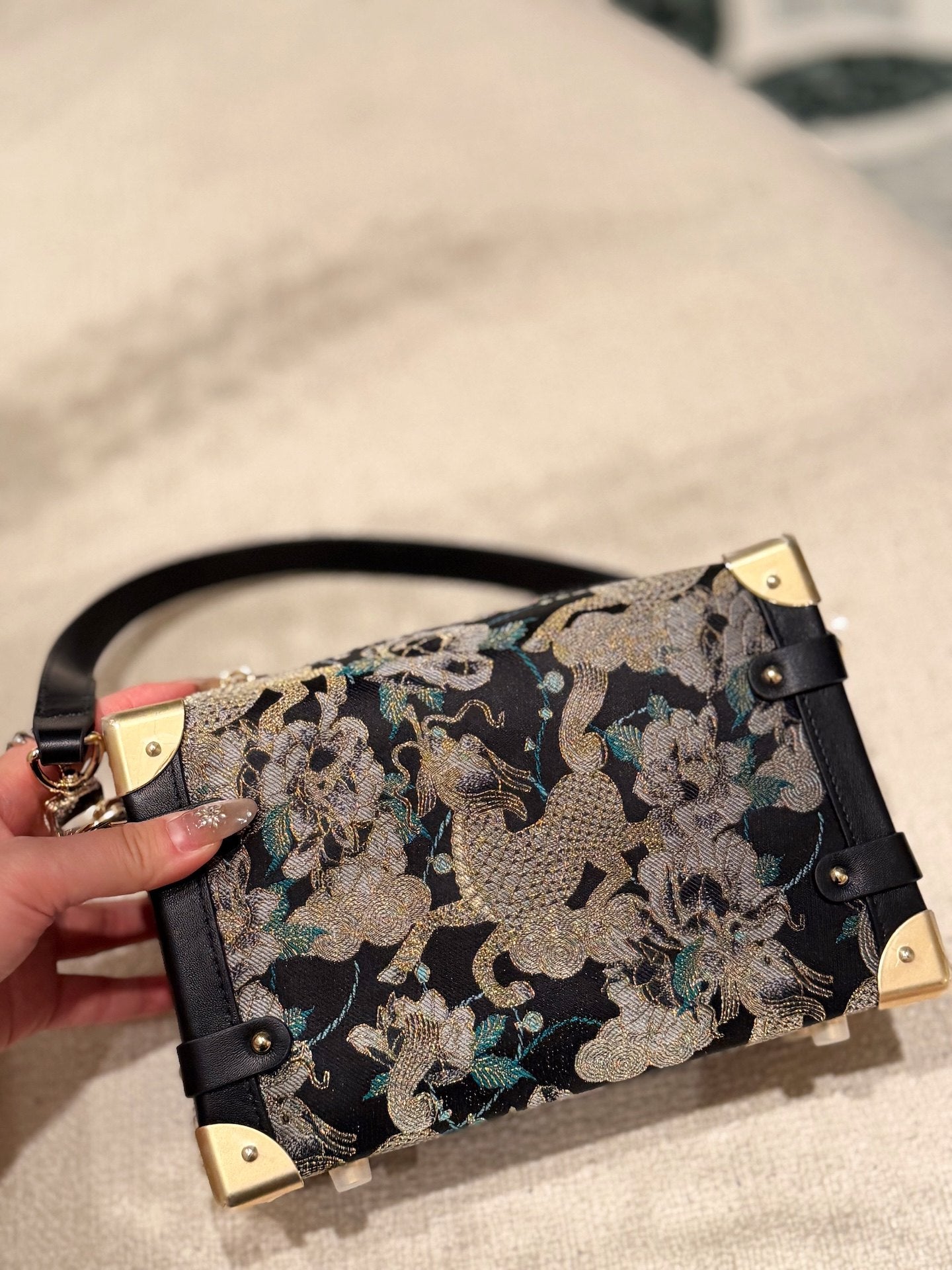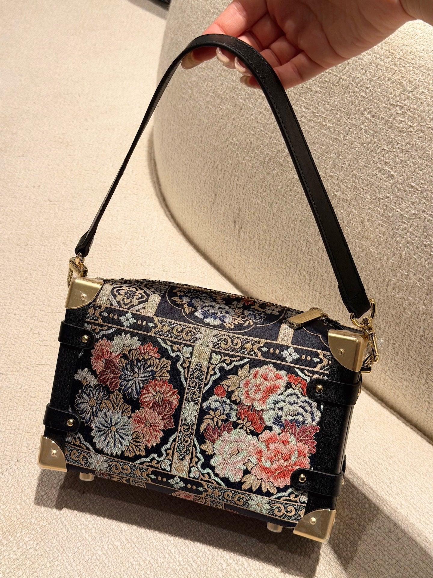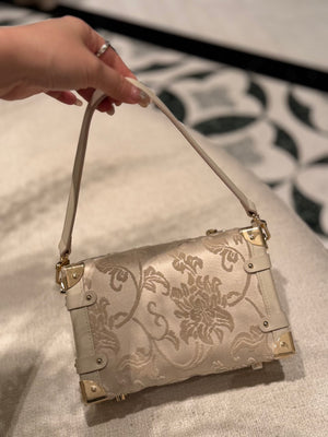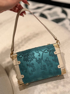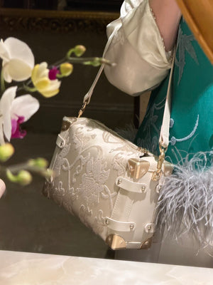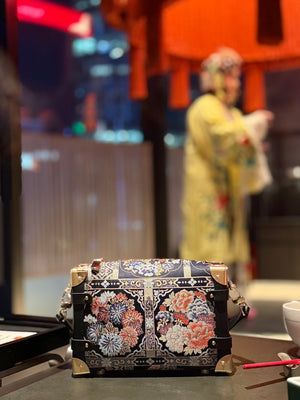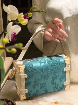 Woven from authentic Song Brocade — one of China’s most refined historical textiles — each bag embodies centuries of artisanal weaving, intricate symbolism, and quiet luxury. The structured “treasure box” form evokes classical travel trunks, while refined leather details and metal corners bring modern elegance and durability.