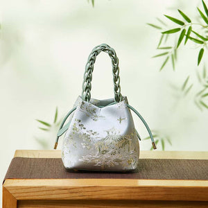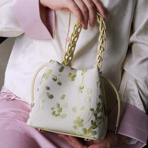 Light Yellow2: Crafted from soft white brocade printed with watercolor-style green foliage motifs. It features a matching braided handle and detachable shoulder strap—light, elegant, and perfect for pairing with hanfu or soft daily outfits.