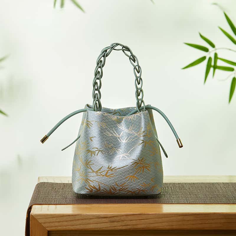 Green1: Features pale silver brocade embroidered with elegant golden landscape patterns (echoing classical Chinese painting aesthetics). The braided handle and adjustable shoulder strap make it suitable for both hanfu and everyday outfits.