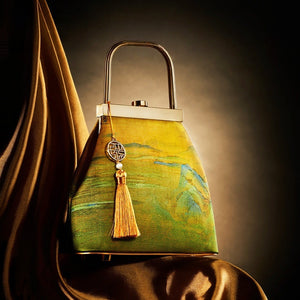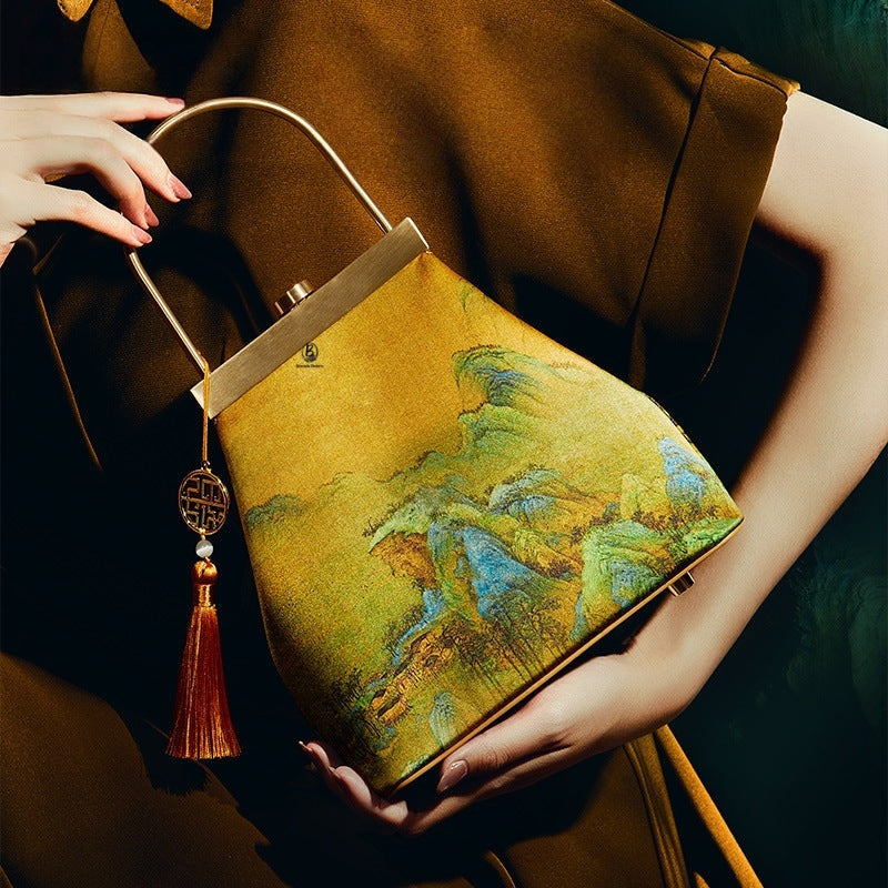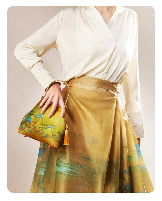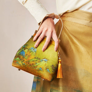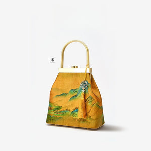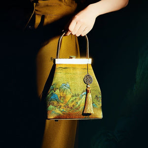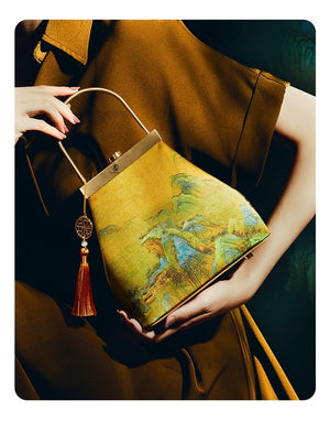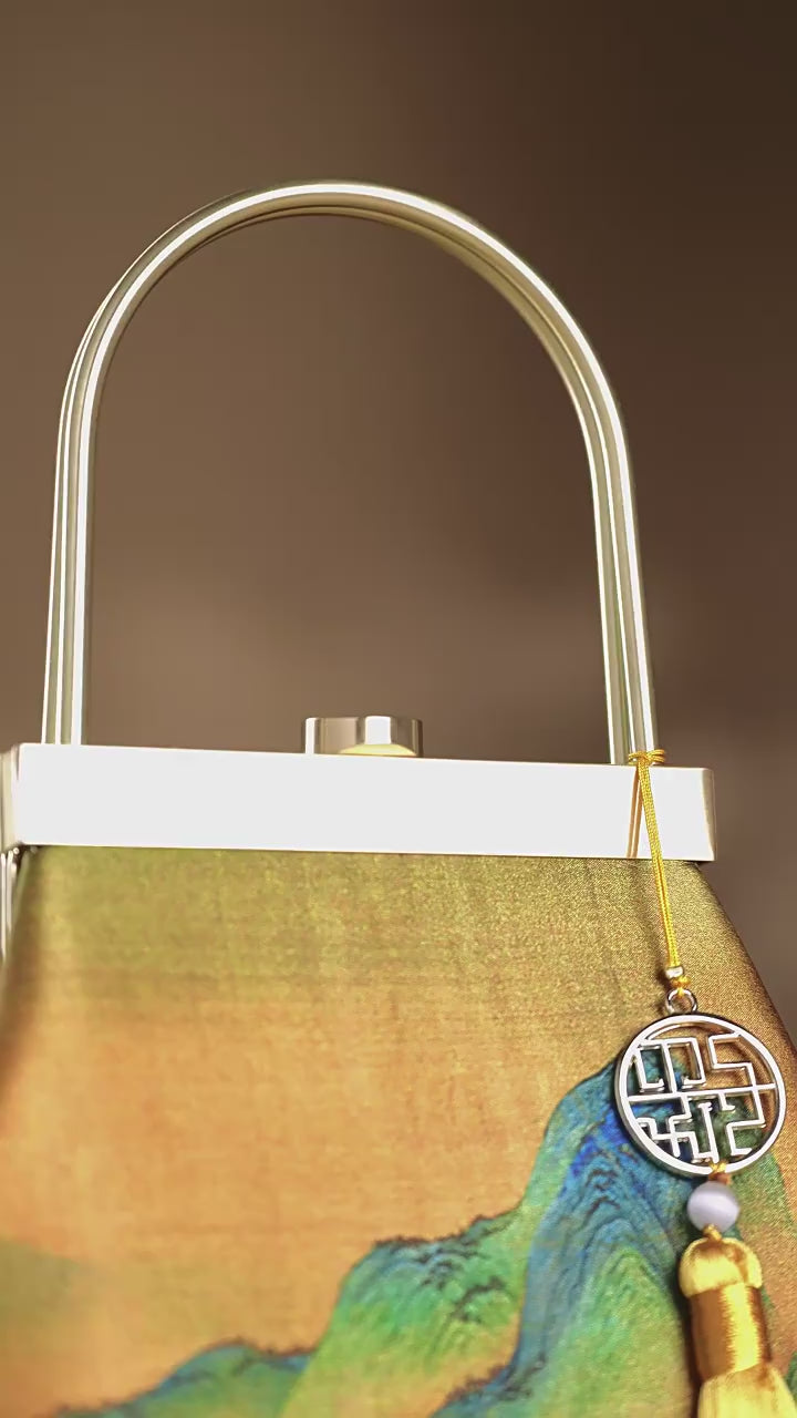 This exquisitely crafted handbag marries traditional Chinese aesthetics with modern accessory design: its lustrous golden brocade surface features vivid classical landscape patterns (echoing the charm of ancient Chinese paintings), while the sleek gold-tone hardware handle and button closure add a polished, elegant touch. The decorative tassel pendant—adorned with a traditional geometric charm and a delicate bead—infuses the piece with lively, timeless character. Soft yet structured, this bag seamlessly complements both hanfu ensembles and modern elegant outfits, making it a perfect blend of cultural heritage and everyday practicality.