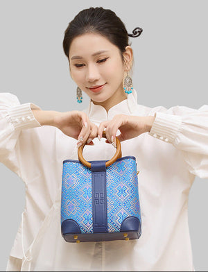This Zhuang brocade bag is a splendid representation of traditional Zhuang ethnic craftsmanship blended with modern fashion. It features a stylish structured design with navy blue leather handles and accents, complemented by golden hardware that adds a touch of sophistication.
