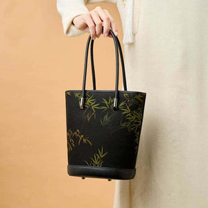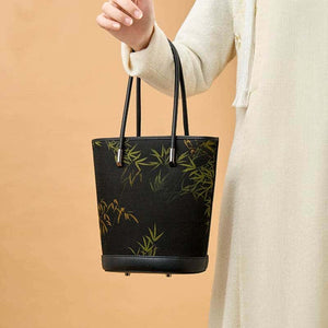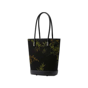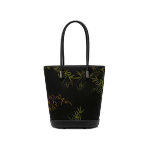 Xiangyunsha Silk Black Bamboo Print Crossbody Bucket Bag