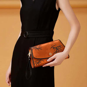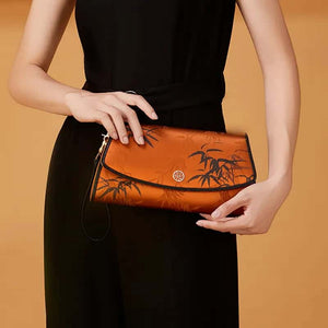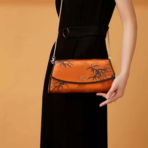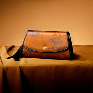 Bring timeless chinoiserie elegance to your look with our Mulberry Silk Bamboo Print Clutch. Crafted from smooth mulberry silk and genuine cowhide leather, this bag features a graceful bamboo forest print that symbolizes resilience and quiet beauty. The sleek silhouette, black leather trim, and tassel detail add a touch of vintage charm, while its detachable strap allows you to wear it as a chic crossbody or carry it as a clutch. Perfect for weddings, evening events, or adding refined style to your everyday outfits.
