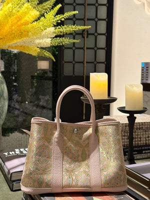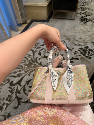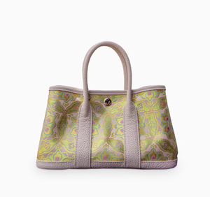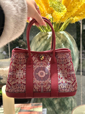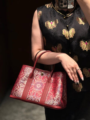 This refined “garden tote” is crafted with Song Brocade (mulberry silk)—a heritage-inspired textile known for its rich woven texture and elegant sheen. Finished with top-grain leather and waxed-thread hand stitching, it balances cultural artistry with a modern, elevated silhouette.