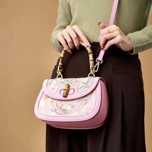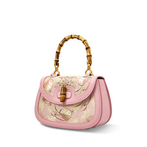 Introducing our Pink Song Brocade Handbag, a stunning fusion of traditional Jin weaving artistry and modern pink elegance. Crafted with shimmering gold threads on a lustrous rose-toned base, this bag features intricate patterns enhanced by the luxurious texture of mulberry silk. The rare Jin weaving technique amplifies the delicate balance of heritage craftsmanship and contemporary soft pink allure, making each piece a timeless statement.