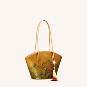 This handbag is a refined expression of traditional artistry and modern elegance. Crafted from heritage-inspired silk fabric, the surface is adorned with a hand-rendered landscape motif, evoking classical Chinese mountain paintings and a sense of timeless serenity.The structured silhouette is complemented by premium leather handles and trim, offering durability while maintaining a soft, luxurious feel. A delicate tassel charm adds movement and symbolic elegance, enhancing the bag’s graceful presence.Designed for both statement and versatility, this piece transitions effortlessly from day to evening, making it ideal for cultural events, art gatherings, or elevated everyday wear.