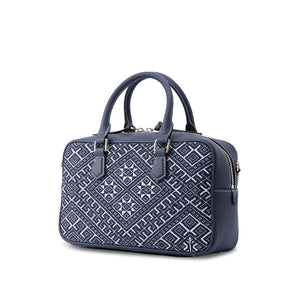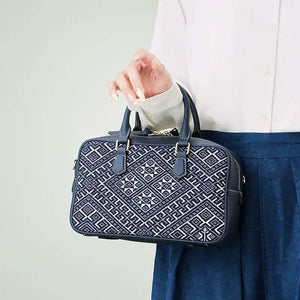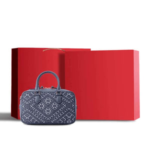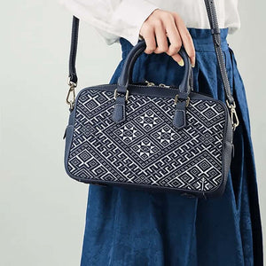 Elevating the heritage of Zhuang brocade, this embroidered leather shoulder bag marries symbolic artistry with refined materials. The Flying Swallow motif—emblematic of harmony and renewed hope—intertwines with the Eightfold Sun pattern (a celestial symbol of fortune), rendered in deep indigo hues through meticulously raised geometric embroidery. Framed by premium cowhide leather trim, the design echoes Guangxi’s intangible cultural legacy, transforming the bag into a portable canvas of ancestral storytelling.