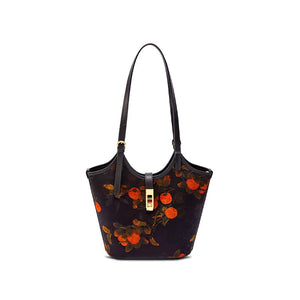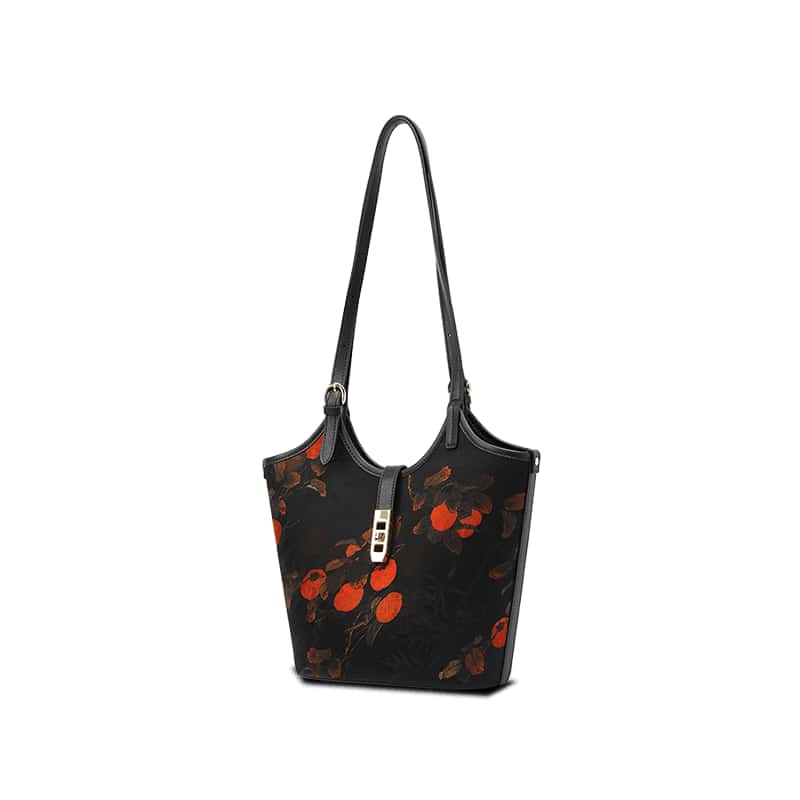 Ce sac à main allie symboles traditionnels chinois et style contemporain. Orné de kakis et de feuilles de bambou, il symbolise la prospérité et le succès. Dans la culture chinoise, le kaki est un porte-bonheur, tandis que le bambou représente la progression continue dans la carrière et les études. Le design, sur fond noir rehaussé de touches de rouge « Cruise » et de vermillon « Kaki », met en valeur le thème du « Shishi Ruyi » (le kaki porte-bonheur). Une fusion parfaite d'héritage et d'élégance signée SinoCultural.