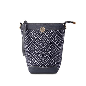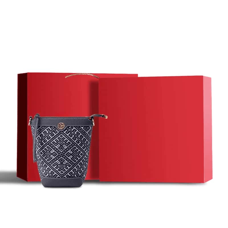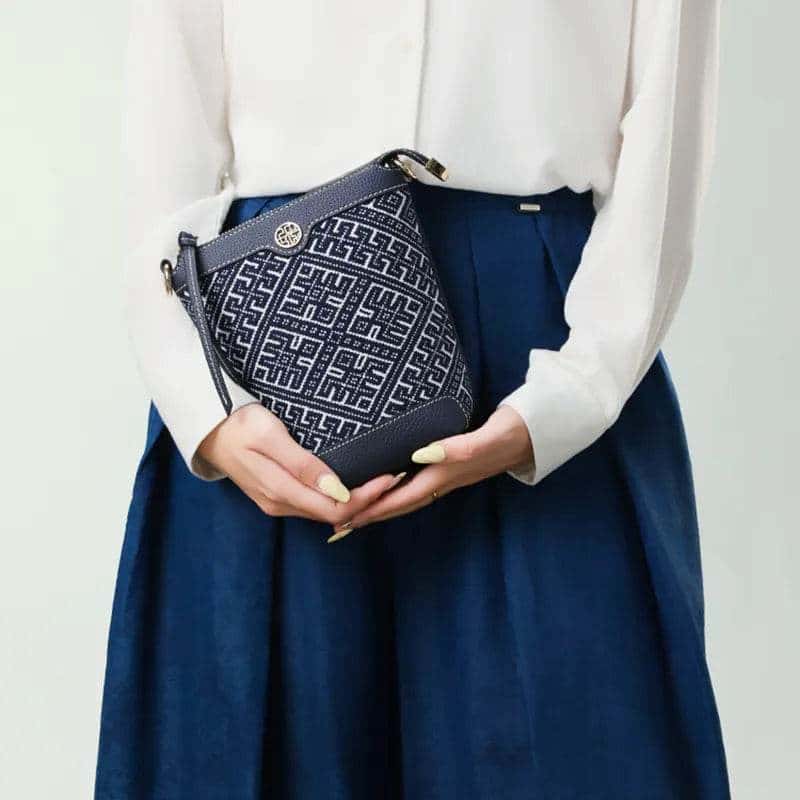 Sublimant l'héritage du brocart Zhuang , ce sac bandoulière en cuir brodé allie art symbolique et matériaux raffinés. Le motif de l'Hirondelle Volante, emblème d'harmonie et d'espoir renouvelé, s'entrelace avec celui du Soleil Octuple (symbole céleste de fortune), rendu dans des tons indigo profonds grâce à une broderie géométrique en relief d'une grande minutie. Bordé de finitions en cuir de vachette pleine fleur , ce modèle fait écho au patrimoine culturel immatériel du Guangxi, transformant le sac en un écrin portatif de récits ancestraux.