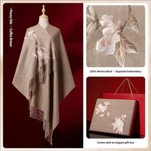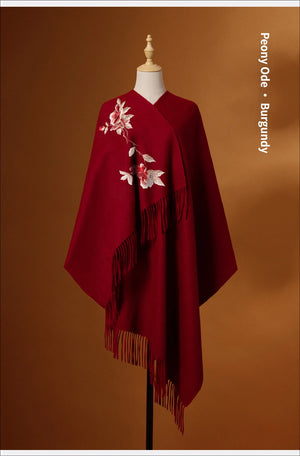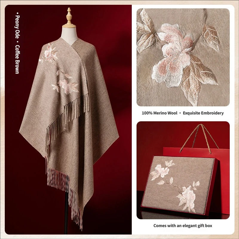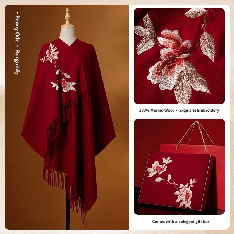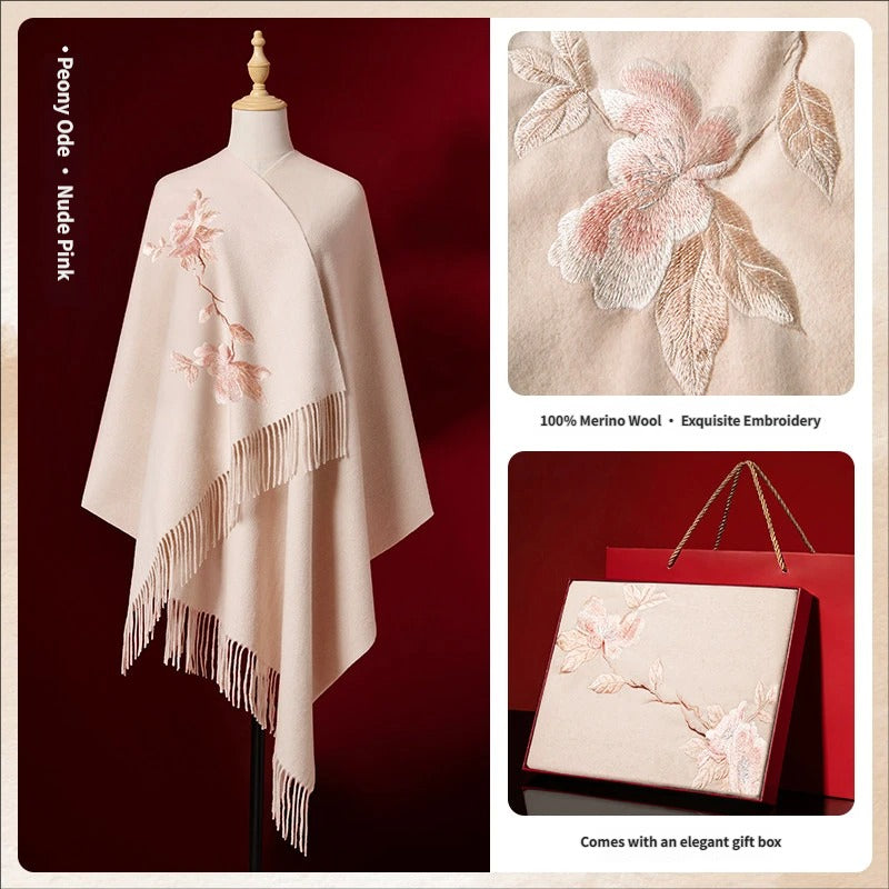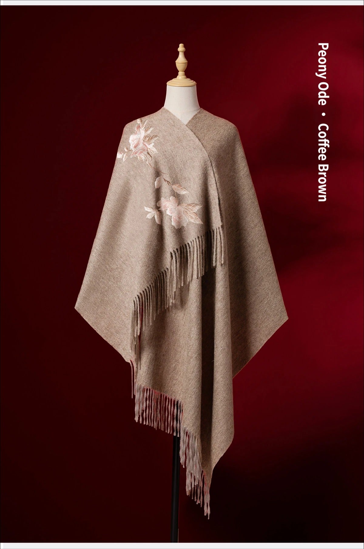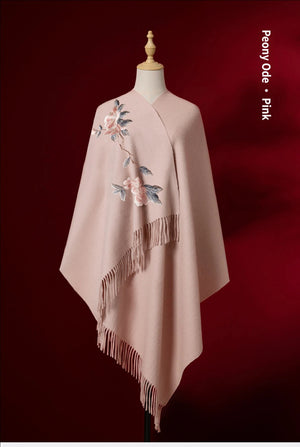 Peony Ode Embroidered Wool Shawl Scarf – Oversized Wrap for Qipao & Women