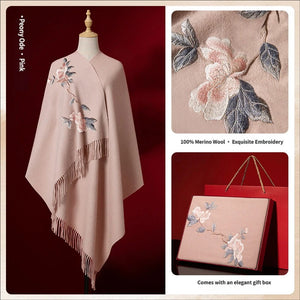 Soft, warm, and effortlessly elegant—this 100% wool embroidered shawl scarf is designed for women who love refined layering. Featuring a delicate peony embroidery and a modern, calm color palette, it can be worn as a wrap, scarf, cape, or poncho-style outer layer—especially beautiful over qipao/cheongsam, dresses, and winter coats.