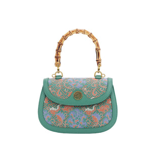 This intangible cultural heritage Song brocade bag is a splendid fusion of traditional art and modern design. It features a structured trapezoidal silhouette with a green leather top handle and a sleek silver metal clasp, exuding an elegant and contemporary vibe.