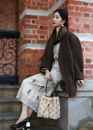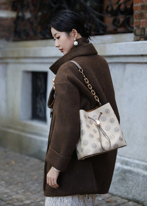 This women’s bucket bag features the Baoxiang Flower (Baoxiang rosette) motif—a classic Chinese decorative pattern celebrated for its layered petals and balanced geometry. The design draws inspiration from traditional artistry and is reimagined in a clean, modern arrangement, creating a look that feels vintage, refined, and effortlessly wearable.