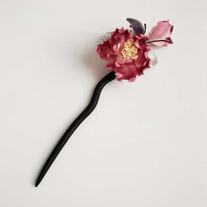 [ Niaoniao Hair Stick] Topped with a hand-sculpted red peony bloom and delicate hand-painted accents, this hair stick is anchored by a smooth, curved ebony wood base. It combines traditional craft with modern elegance, providing a secure, comfortable hold for updos and half-up styles.
