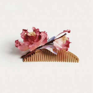 [Niaoniao Hair Comb] Adorned with a cluster of hand-formed red peonies and gradient leaves, this gold-tone metal comb offers a secure hold for both everyday and special-occasion hairstyles. Each petal is shaped and dyed by hand, reflecting the intricate artistry of the Ronghua craft.