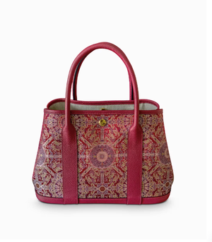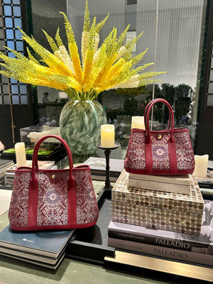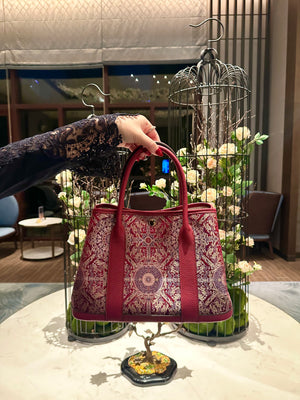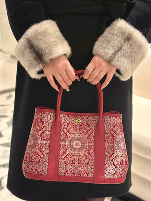 Structured yet soft in presence, the bag features leather-trimmed handles and a compact silhouette designed for modern daily use. The symmetrical brocade motif draws inspiration from historical architectural and textile patterns, symbolizing balance, continuity, and cultural refinement.