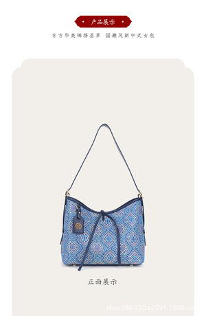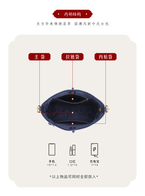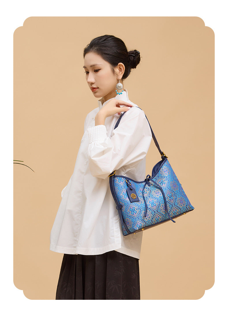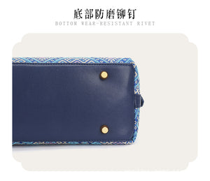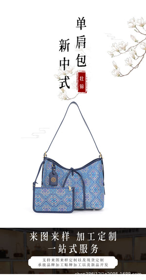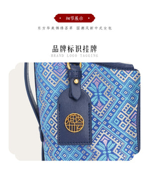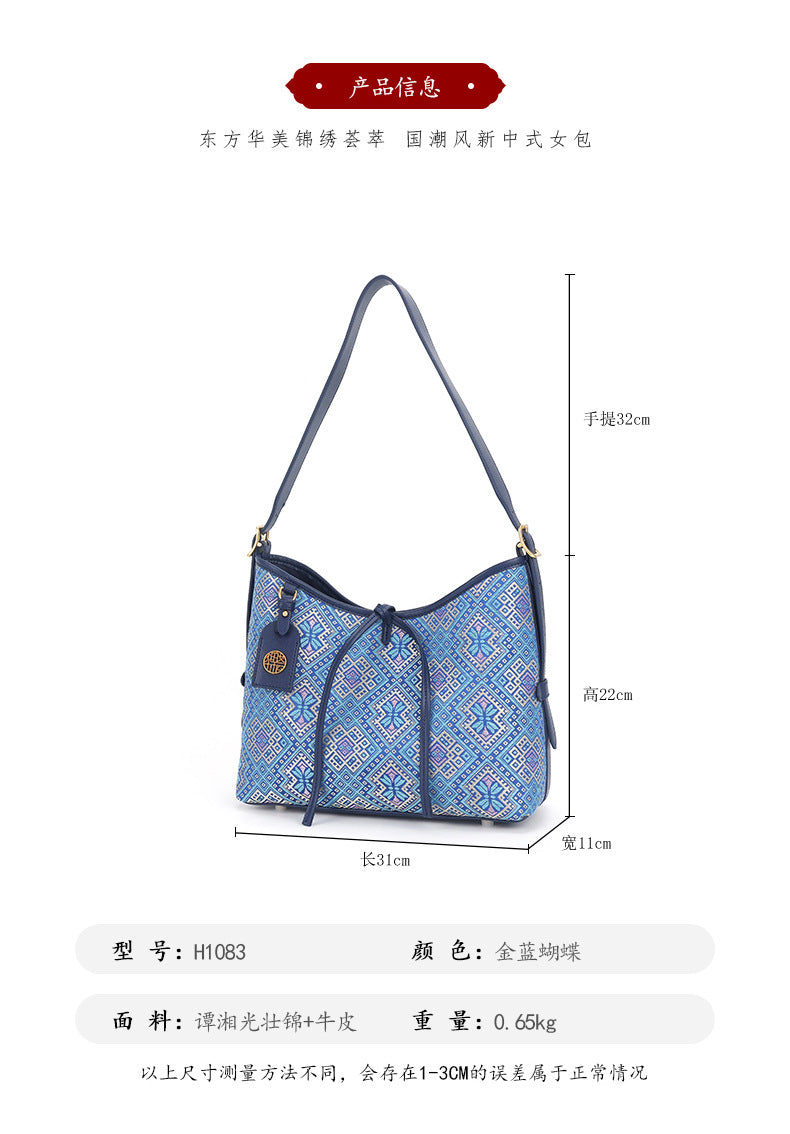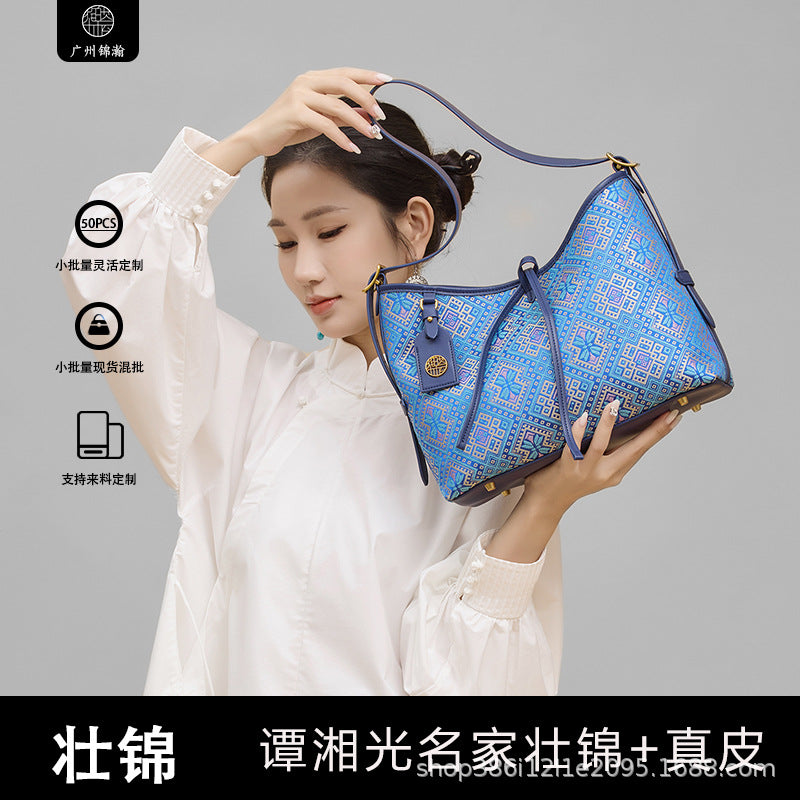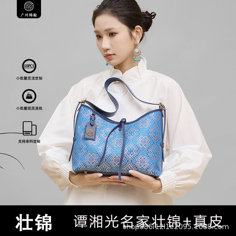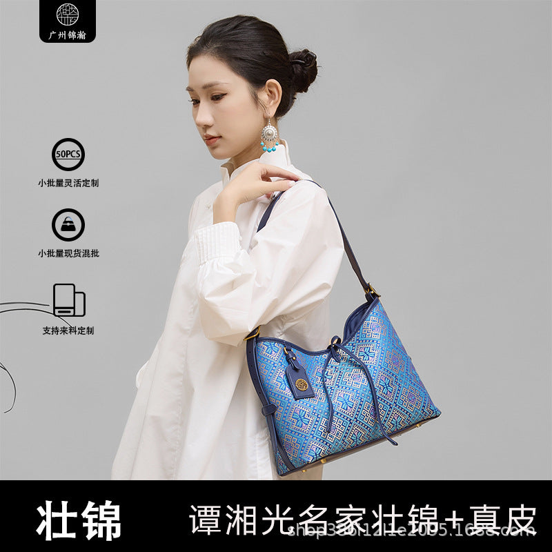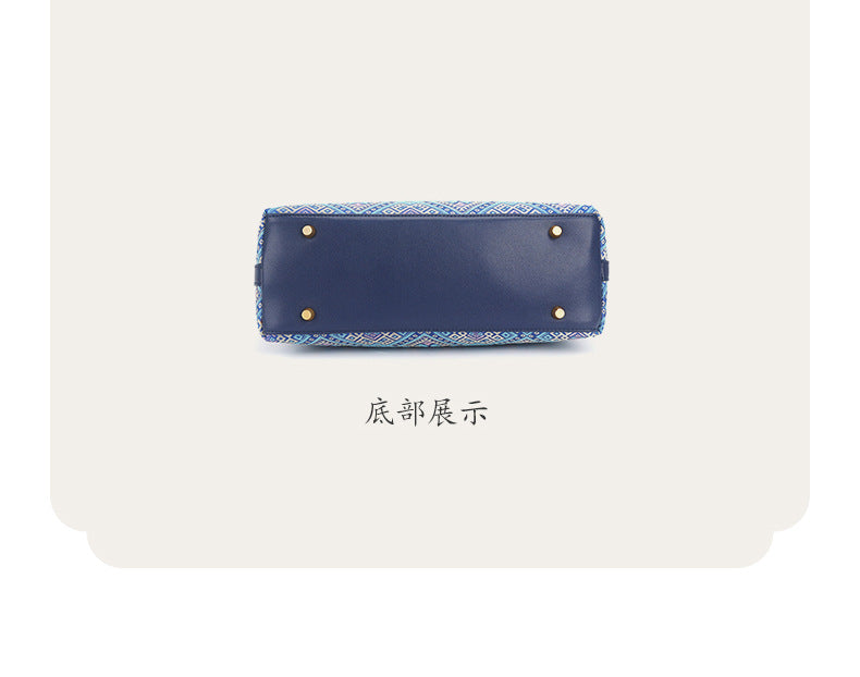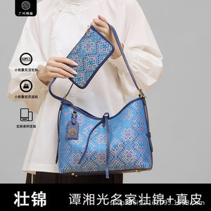 Tan Xiangguang Famous Zhuang Brocade Bag New Chinese Style National Style Tote Bag Genuine Leather High-end Sense Deep Blue Fashion Mother and Child Bag