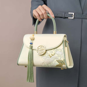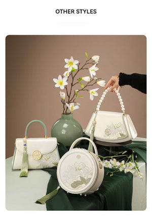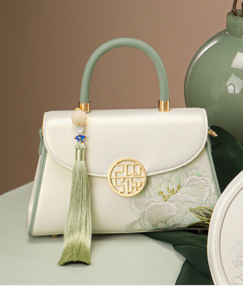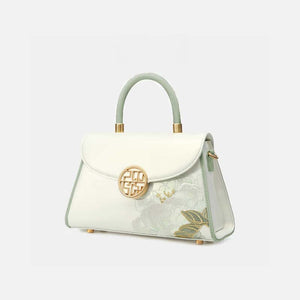 这款手提包上绣着精致的芙蓉花,宛如盛开的花朵,为整体造型注入了浪漫而艺术的气息。精湛的刺绣工艺赋予花朵图案生命力,使其栩栩如生,充满活力。这款手提包不仅实用,更是一件独具风格的时尚单品。